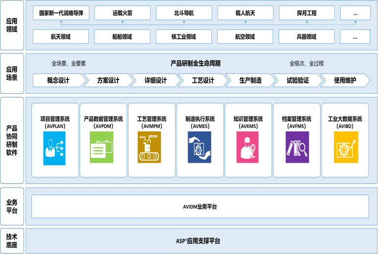 公司憑借在航天及國防軍工等復(fù)雜裝備研制信息化領(lǐng)域30余年的積累和實(shí)踐,形成了以AVIDM為品牌的核心工業(yè)軟件產(chǎn)品體系。AVIDM系列軟件主要包括項(xiàng)目管理系統(tǒng) (AVPLAN)、產(chǎn)品數(shù)據(jù)管理系統(tǒng)(AVPDM)、工藝管理系統(tǒng)(AVMPM)、制造執(zhí)行系統(tǒng)(AVMES)、知識(shí)管理系統(tǒng)(AVKMS)、數(shù)字檔案管理系統(tǒng)(AVFMS)和工業(yè)大數(shù)據(jù)系統(tǒng)(AVIBD)等子產(chǎn)品。