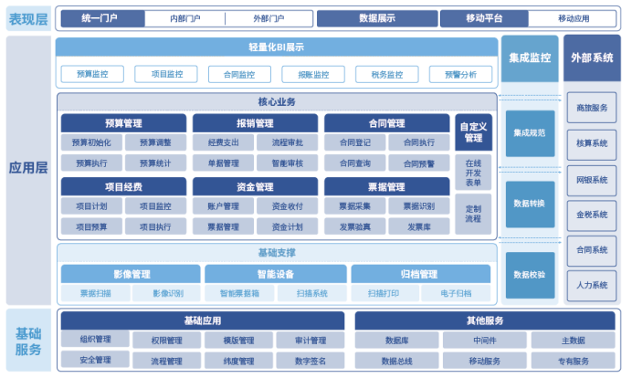 ??財金管控系統(tǒng)是為適應集團化企業(yè)“戰(zhàn)略管控”、“財務管控”、“業(yè)務管控”的管理模式的現(xiàn)狀研發(fā)的產品,擁有“高可用、高擴展、高易用”的產品特色,將移動互聯(lián)、人工智能、大數(shù)據(jù)技術與財務信息化經驗(系統(tǒng)功能、安全保密、模塊劃分、業(yè)務需求等)積累充分結合,為企業(yè)提供符合自身業(yè)務特點的開放型財務共享服務平臺。